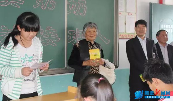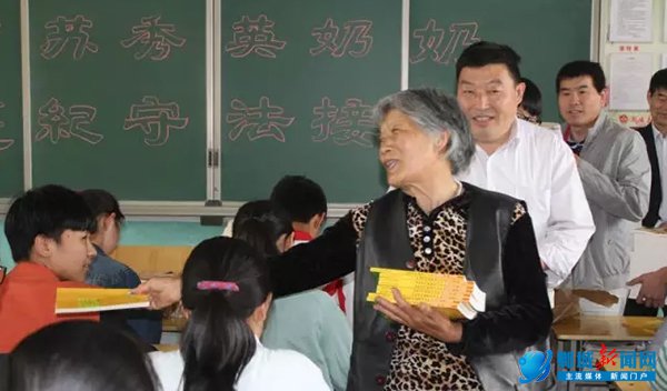 听说苏奶奶要来给自己发书,学生们可高兴了,在黑板上工工整整地写下“向苏奶奶学习,做遵纪守法接班人”的欢迎标语。在第二实验中学九(1)班教室里,苏秀英把《中学生法律知识读本》和《廉洁教育》一一发送到学生手中,一边发一边和孩子们交流,嘱咐他们要好好学习,遵法守纪,做一个德智体美全面发展的社会主义接班人,立志成才,为国家、为社会做贡献。学生们双手接过书本,以热烈的掌声表示对苏奶奶的感谢。