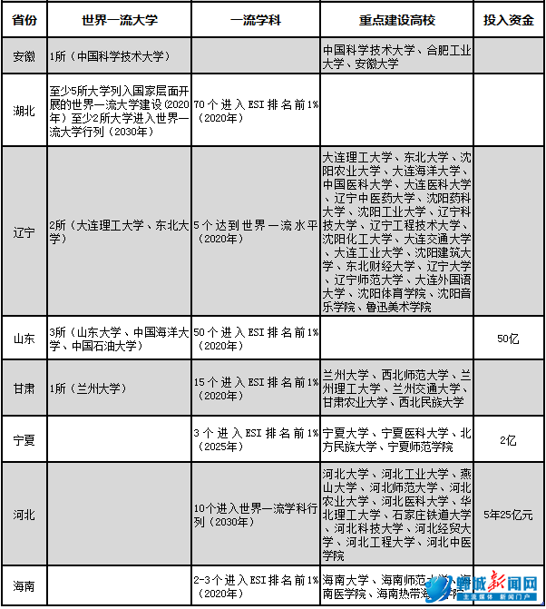 人民网北京2月10日电(孙竞)新年伊始,教育部、财政部、国家发展改革委联合印发《统筹推进世界一流大学和一流学科建设实施办法(暂行)》,按照每五年一个建设周期,2016年开始新一轮建设,建设高校实行总量控制、开放竞争、动态调整机制。“双一流”建设成为了继“211工程”和“985工程”之后,又一个备受关注的高等教育发展战略。 《实施办法》是对2015年10月24日国务院印发的《统筹推进世界一流大学和一流学科建设总体方案》的细化。 按照《实施办法》的要求,省级政府应结合经济社会发展需求和基础条件,统筹推动区域内有特色高水平大学和优势学科建设,积极探索不同类型高校的一流建设之路。记者关注到,目前至少有有辽宁、安徽、河北、山东等8个省份陆续出台了“双一流”建设相关方案或文件,一批重点支持的名校名单浮出水面。 老牌知名高校占据优势 虽然外界一直关注哪些高校能入选“双一流”,但在名单遴选确定之前,一切都是未知数。不过,通过各省的建设方案来看,老牌知名高校以及传统优势学科,依旧是地方省区市着力支持的重点。 在安徽省的高校建设目标中,明确提出“支持中国科学技术大学建设世界一流大学”。山东将 “积极支持山东大学、中国海洋大学、中国石油大学等驻鲁部属高校进入国家“双一流”建设工程”。辽宁的目标是“2020年,大连理工大学、东北大学学科建设水平进一步提升,为冲击世界一流大学打下坚实基础。”就目前来看,各省份公布的“支持建设世界一流大学”的名单均是原来的“985工程”重点建设项目高校。 部分省份推进世界一流大学和一流学科建设的相关计划
