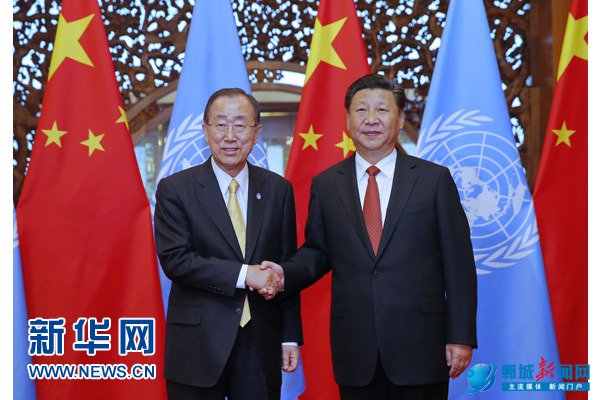 习近平欢迎潘基文出席9月二十国集团领导人杭州峰会。习近平指出,中方高度重视并同联合国在发展和气候变化等问题上开展了密切合作,取得了重要进展。中方推动二十国集团领导人峰会聚焦发展问题,推动共建“一带一路”,就是要助力2030年可持续发展议程。中方倡导设立亚投行,并愿同联合国、世界银行等国际组织加强合作,就是要同世界各国分享中国的发展机遇。